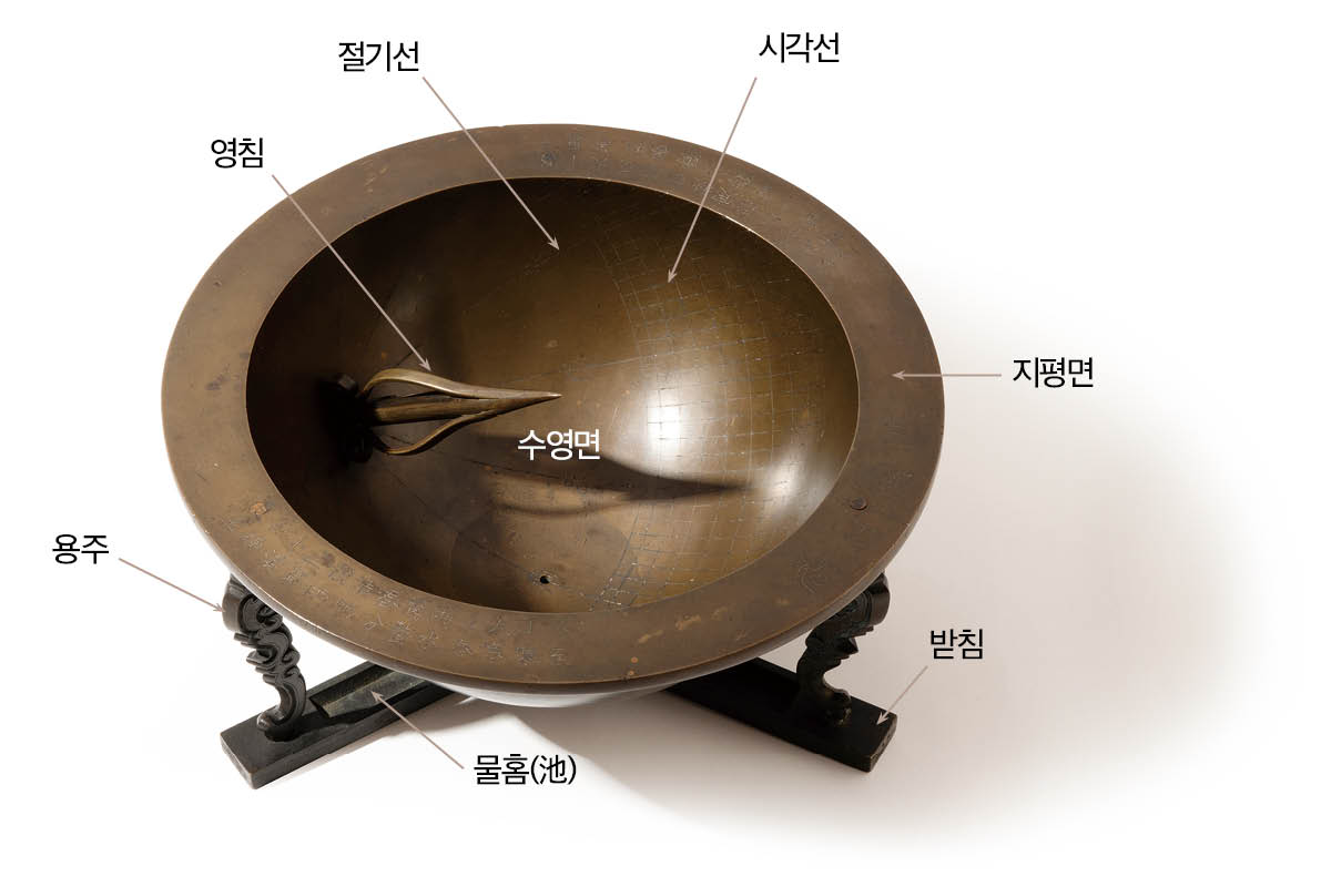 당시에 시간과 책력은 국가에서 관리하고 배포했지만 앙부일구를 보면 농사에 중요한 24절기와 1년 동안 해가 뜨고 지는 시간을 알 수 있어 낮과 밤의 길이까지 가늠할 수 있었다. 다양한 기능으로 창제한 앙부일구는 농경사회에 꼭 필요한 달력을 담고 있는 그릇이었다. 앙부일구의 일반적인 구조는 그림 1에서 보는 것과 같이 오목한 반구의 수영면受影面, 영침影針과 지평환地坪環, 십자 받침대와 용주龍柱로 구성되어 있다.